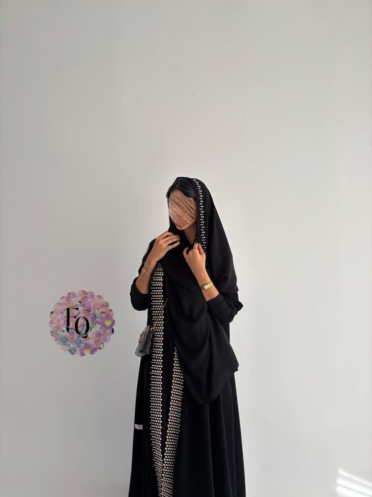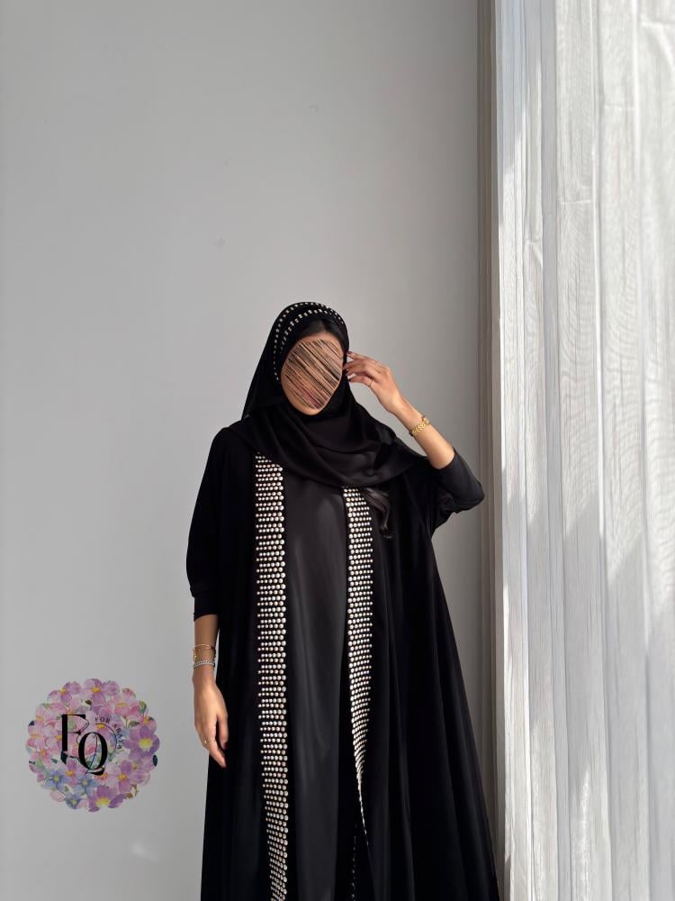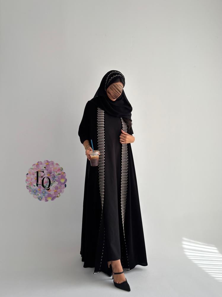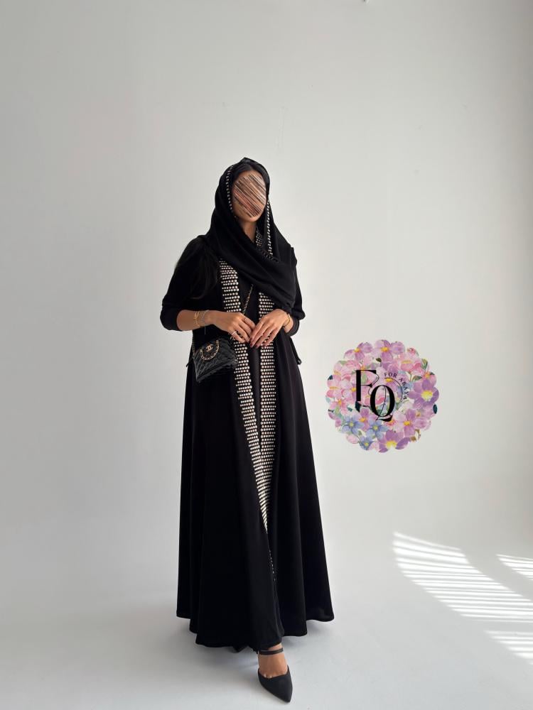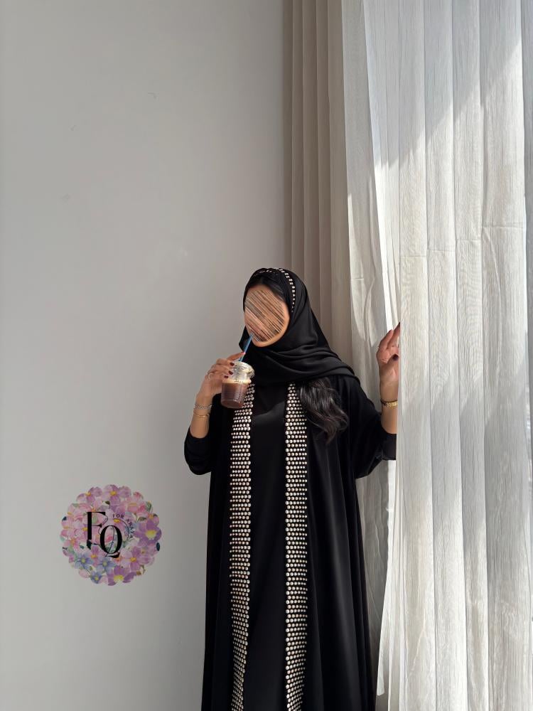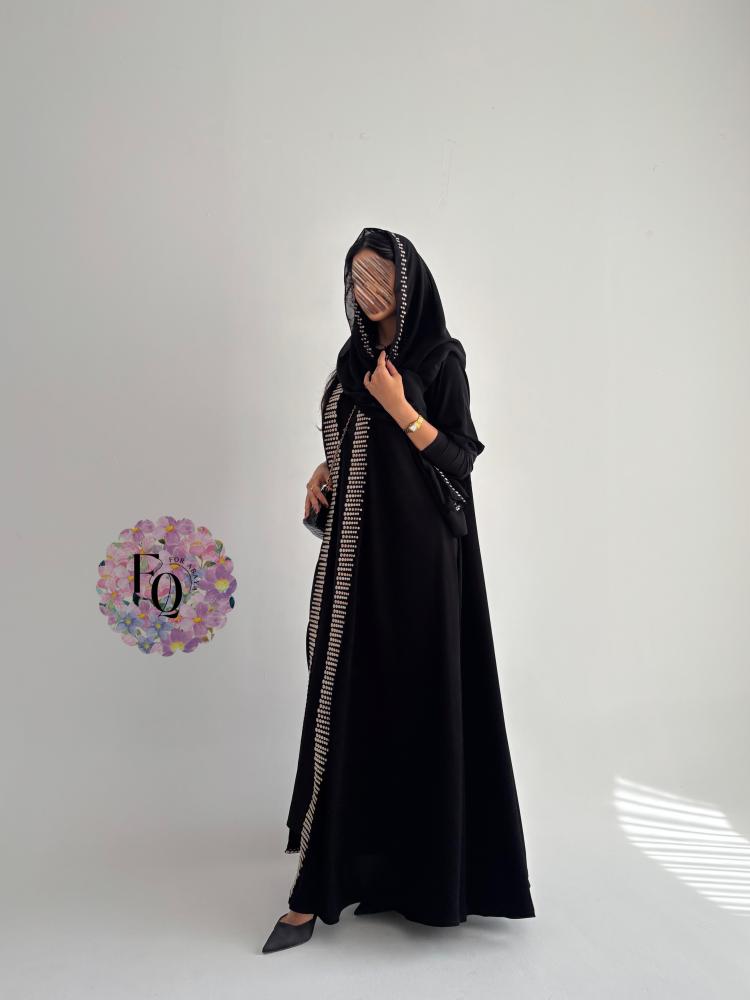 عباية فاخرة بتصميم أنيق من قماش الكريب الفاخر، تتميّز بأكمام استرتش مطرزة بتطريز بيج راقٍ، مع قصة كلوش تمنحها انسيابية مميزة وأناقة فريدة.