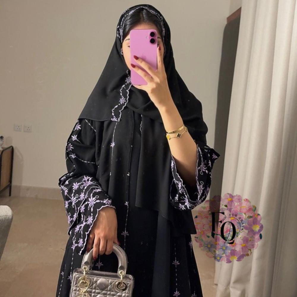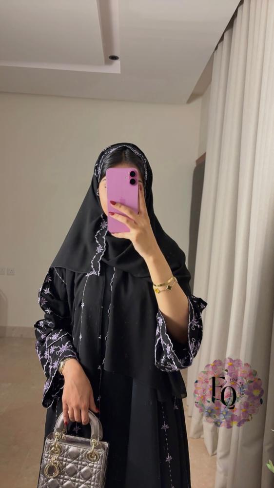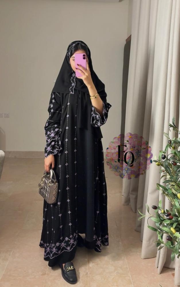 عباية فاخرة من قماش الكريب المطرّز بتطريز ناعم بلون موف أنيق، بتصميم قصة A تمنح انسيابية وجاذبية في الإطلالة. تأتي مع طرحة مطرّزة متناسقة لإكمال المظهر الأنيق والمميز.