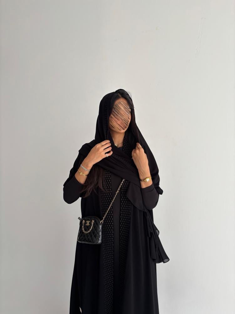 عباية فاخرة بتصميم أنيق من قماش الكريب الفاخر، تتميّز بأكمام استرتش مطرزة بتطريز أسود راقٍ، مع قصة كلوش تمنحها انسيابية مميزة وأناقة فريدة.